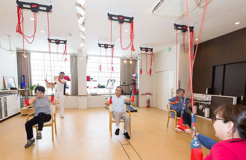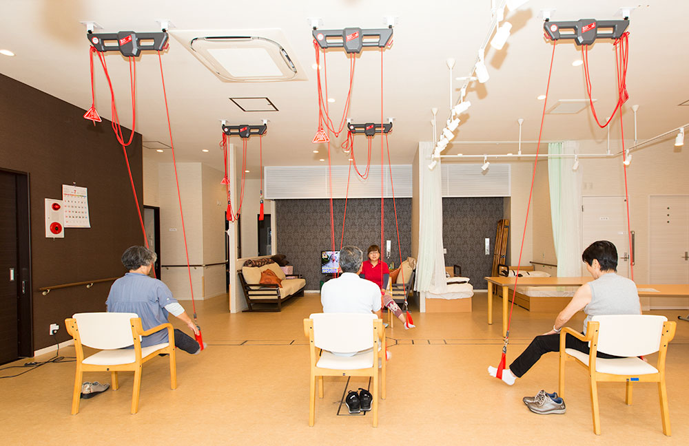 歩行に自信がなくても安心して身体を動かすことが出来る、体幹(身体の主要部分)運動。ロープに身体を任せての動作となるので、身体が不自由な方でも楽に身体を動かすことができ、無理なく運動することができます。 また、トレーナーの指導の下に行うので、脳トレにもなり、みんなで楽しく有酸素運動ができ、ダイエット・運動不足・ストレス解消にも効果的です。